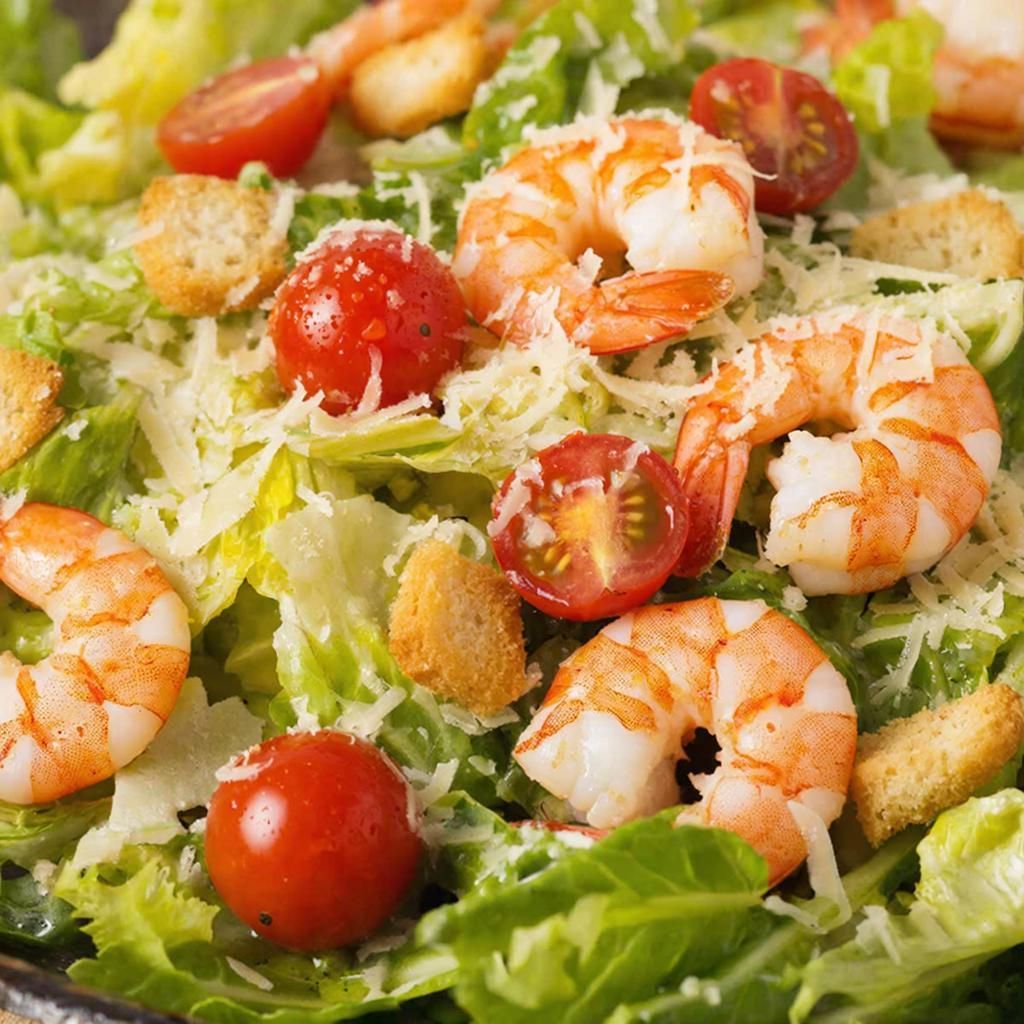- Выложите салат на блюдо, сверху распределите горячие креветки, посыпьте оставшимся пармезаном и гренками.