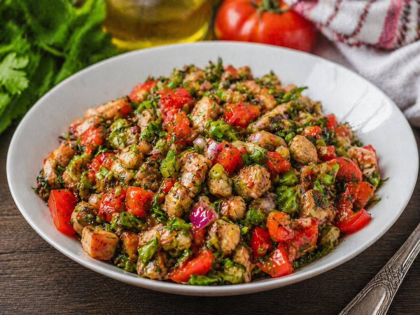 - Затем добавьте нарезанные свежие лук, чеснок, вымытую зелень, уксус, посолите, поперчите и подавайте к столу сразу же, пока овощи не успели остыть.